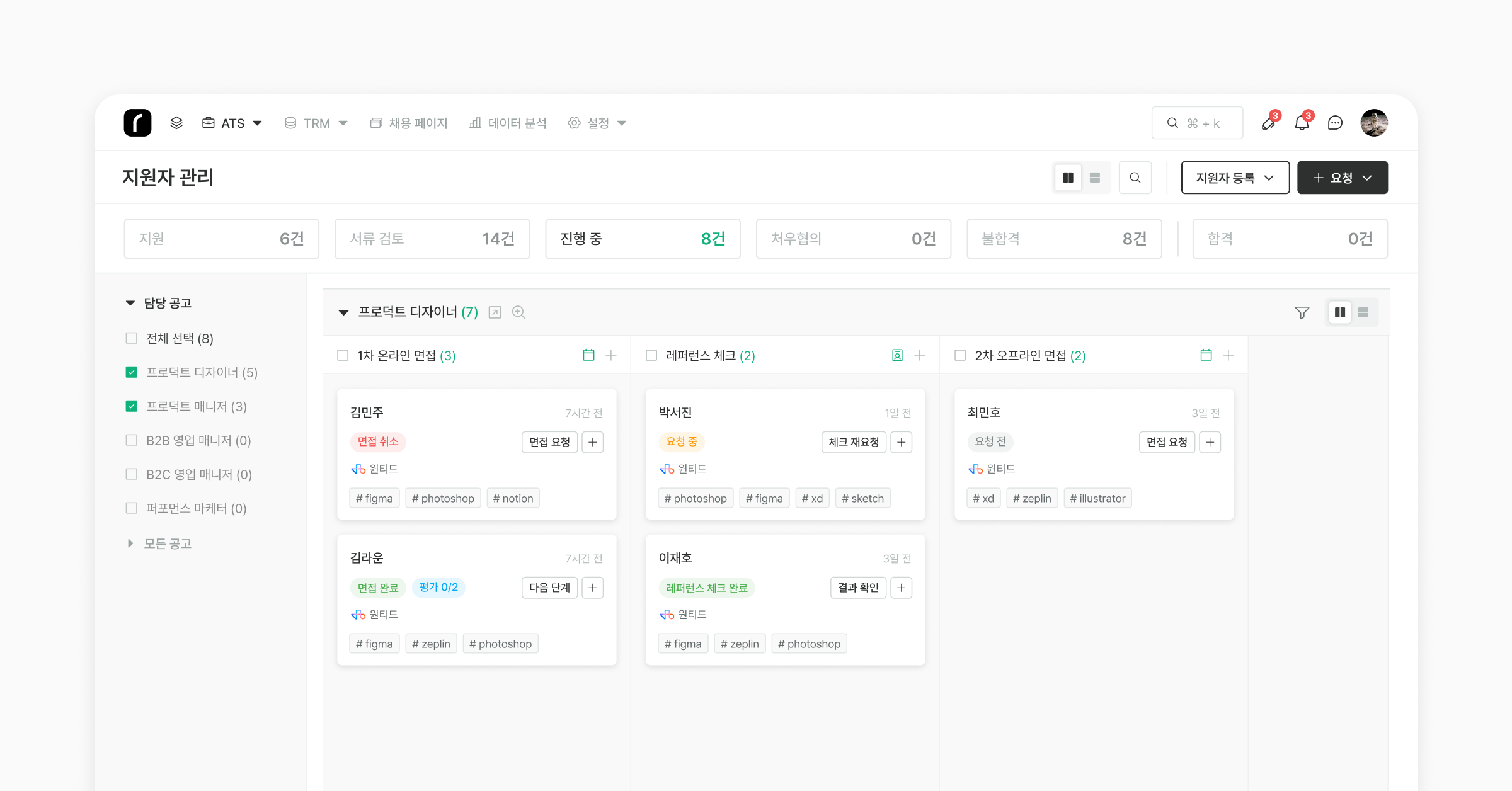 : 지원자들이 서류를 제출하면 채용 프로세스에 따라 지원자별 단계가 서로 달라집니다. 누군가는 서류 심사에, 누군가는 면접 단계에, 누군가는 과제 단계에 있죠. 이때 채용 담당자는 가장 바빠집니다. 매일 확인하고 조율하고 안내해야 할 사람이 정확히 누구인지 파악하고 응대해야 하기 때문입니다. 그런데 이 지원자의 상태를 ATS가 자동으로 칸반 보드(업무 흐름을 카드 형태로 표시)화 한다면? 채용 담당자는 그 보드만 보면 됩니다. 누가 현재 어떤 상태에 머물러 있고, 몇 명에게 어떤 메시지를 보내면 될지, 아침에 출근해 지원자 관리 페이지만 열면 오늘 진행할 채용 커뮤니케이션 업무가 바로 파악되는 것입니다.