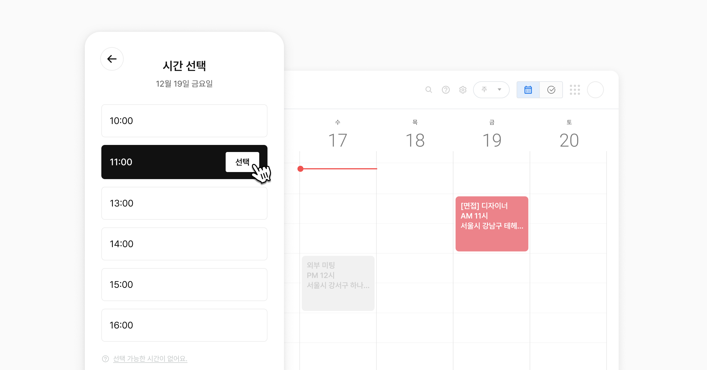반대로도 가능해요. 지원자가 먼저 가능한 시간대를 선택한 후 면접관들이 그 중 가능한 일정을 고를 수도 있어요. 일정 변경도 지원자가 예약 링크에 다시 접속해 일정 변경을 클릭하고 다른 일정을 선택하면 번거로운 커뮤니케이션 없이 변경된 일정으로 캘린더에 자동 반영됩니다.