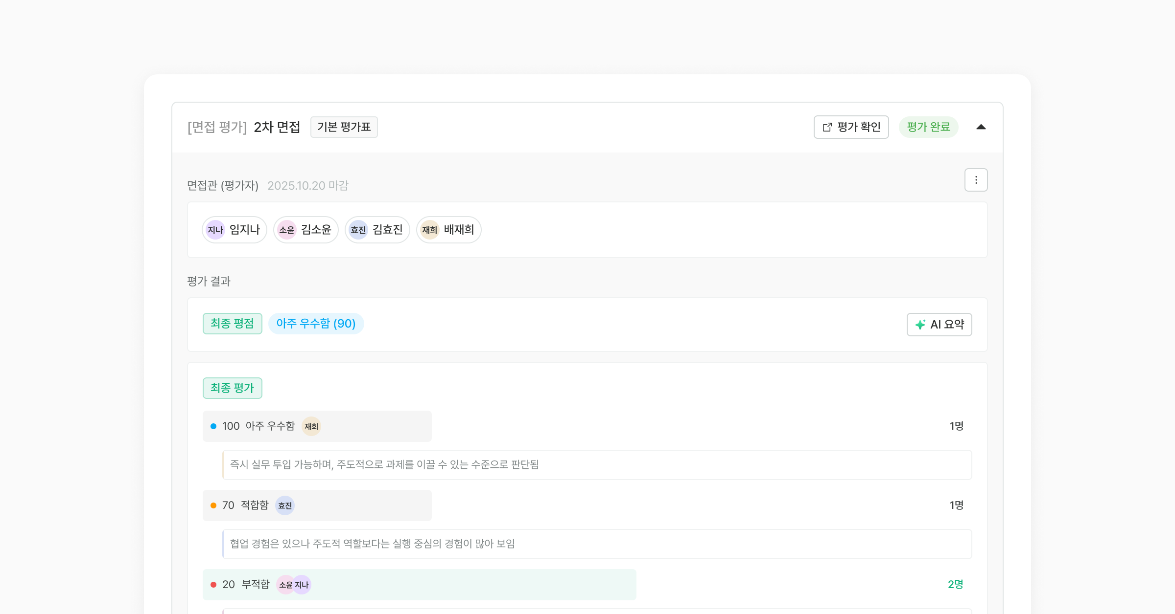 : “괜찮은 것 같아”, “우리랑 잘 맞을 것 같아”와 같은 말은 현장에서는 뚜렷이 기억하지만, 조금만 시간이 지나도 기억에 남지 않습니다. 특히 2인 이상 채용팀에서는 각자 느낀 판단의 이유가 기록으로 남아야 현장에 대한 기억을 다시 상기하고 언제든 걱정 없이 판단할 수 있습니다.