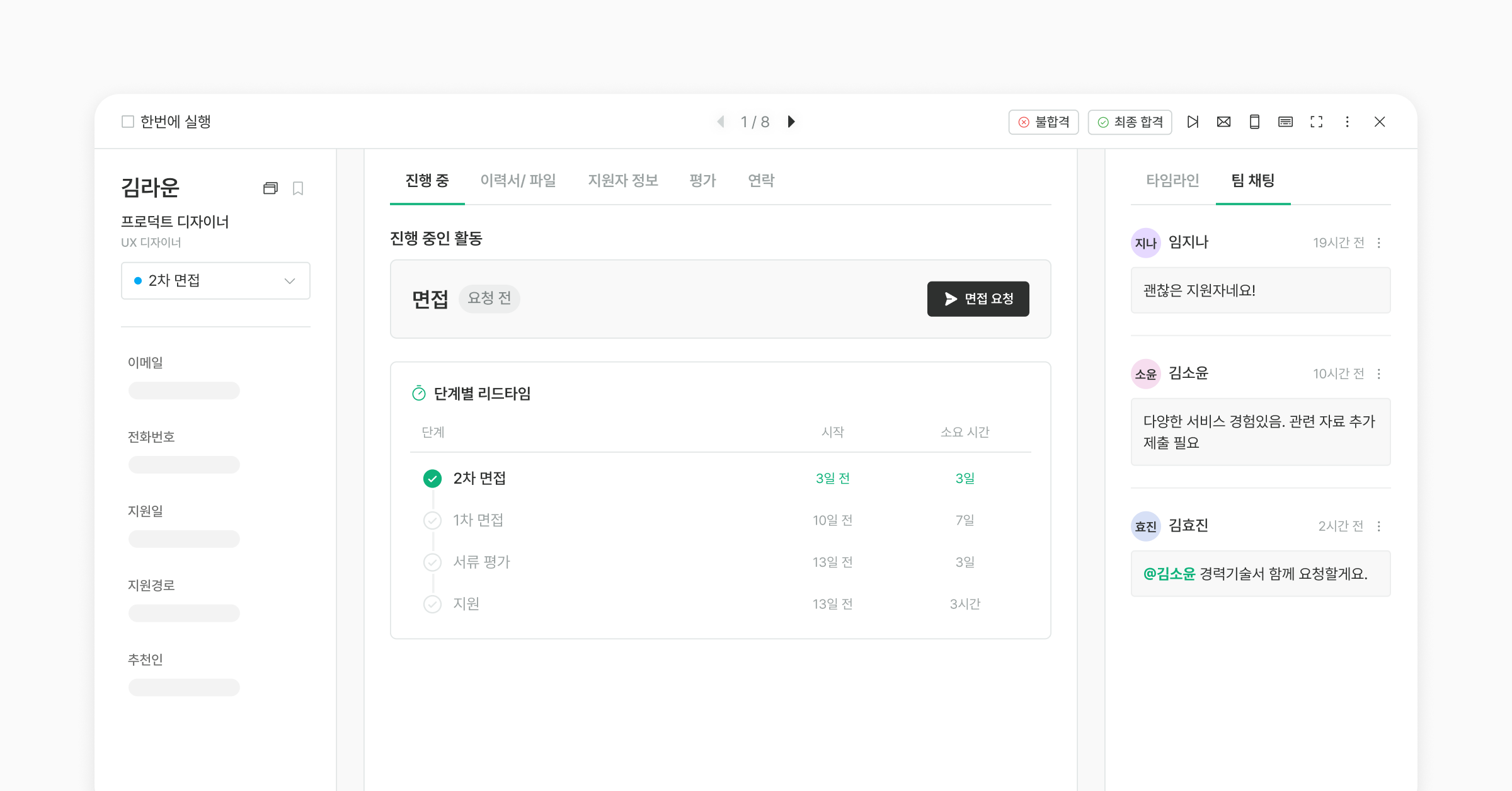: A 지원자를 누가 언제 검토했고, 아직 안 본 사람이 누구인지 분명하지 않으면 같은 이력서를 또 두 번 보는 불상사가 발생합니다. 이 과정에서 휴먼에러가 발생할 수 있고, 중요한 지원자를 놓칠 수도 있지요.