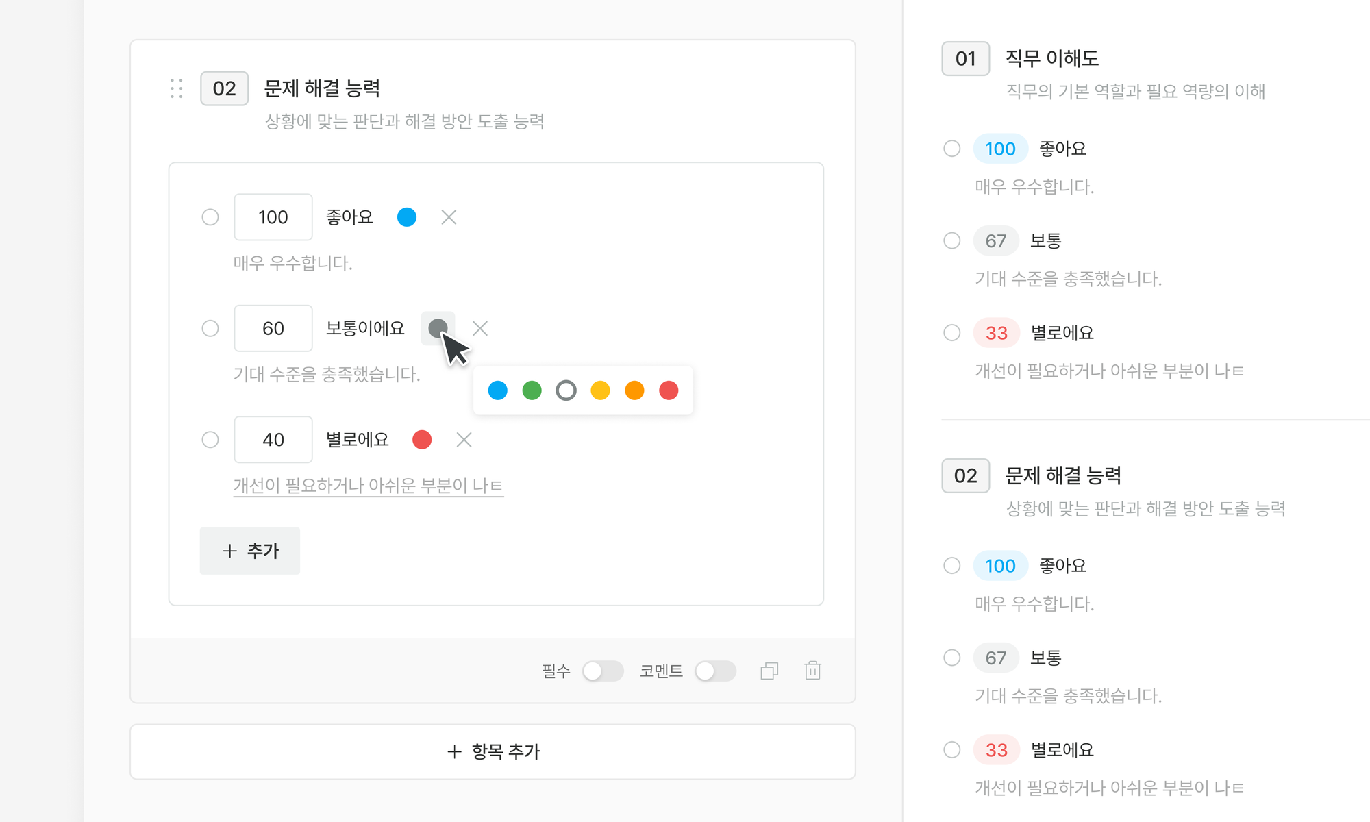 상중하, 1~5점 등 명확한 기준을 제시합니다.