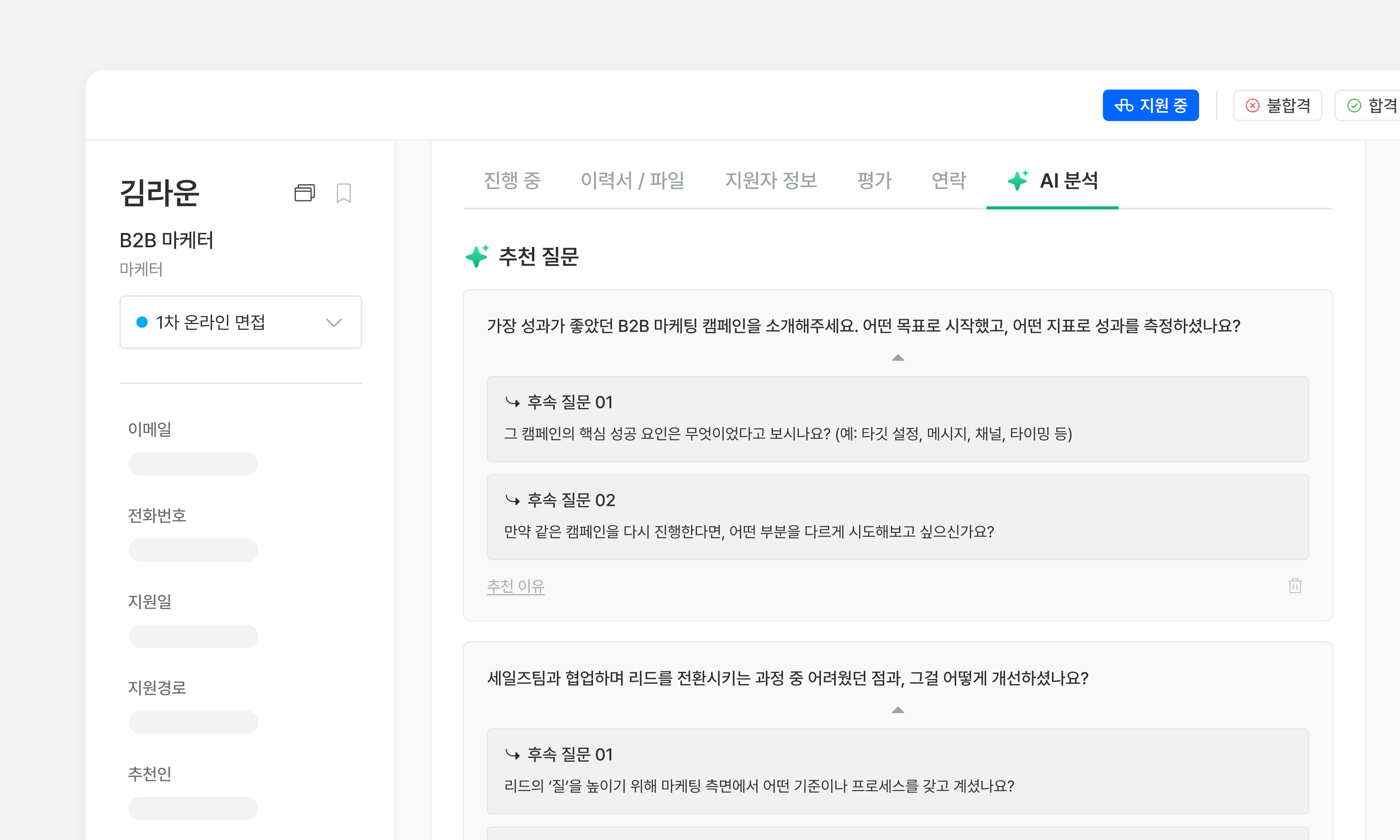 구조화된 면접 질문을 촘촘히 설계하고, 면접관들도 교육 받은 대로 공정하게 면접을 진행했지만, 지원자의 답변이 부실할 수 있습니다. 이때 지원자의 능력과 경력을 확실히 확인하기 위해 좀 더 예리한 추가 질문이 필요한데요. 라운드HR이 제공하는 채용 전용 AI, ‘라운드AI’는 JD와 이력서를 분석해 행동면접기반의 맞춤형 면접 질문과 후속 질문을 제안합니다. 지원자가 이력서에 기재한 내용을 면밀히 검증하기 위한 추천 질문을 제안하는 것인데요. 구조화된 면접 템플릿을 활용하되, 현장에서 지원자의 답변이 불충분하거나 두루뭉술하다면 라운드AI의 추천 및 후속 질문을 참고하여 지원자의 역량을 검증할 수 있습니다.
