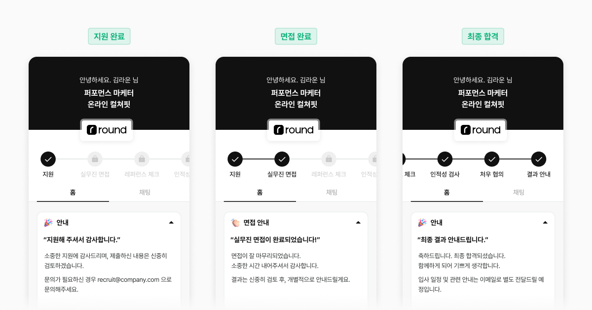 | 면접 후 안내 메시지 전송 → 결과 및 향후 일정에 대한 정보 획득으로 기다림이 완화됩니다. |