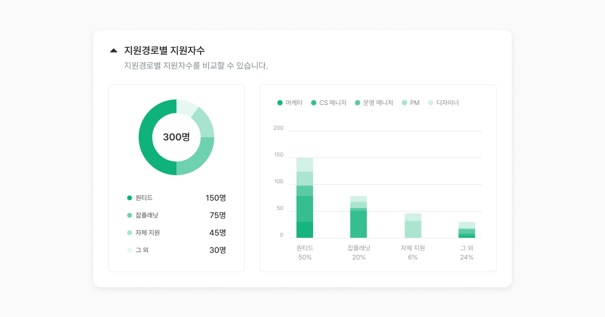 단계별 지원자 수, 최종합격자 리스트, 지원경로별 전환율 등 꼭 필요한 차트를 자유롭게 선택해 맞춤형 대시보드를 구성할 수 있고, 모든 데이터는 위와 같이 시각화되어 분석 결과를 한눈에 확인할 수 있습니다.