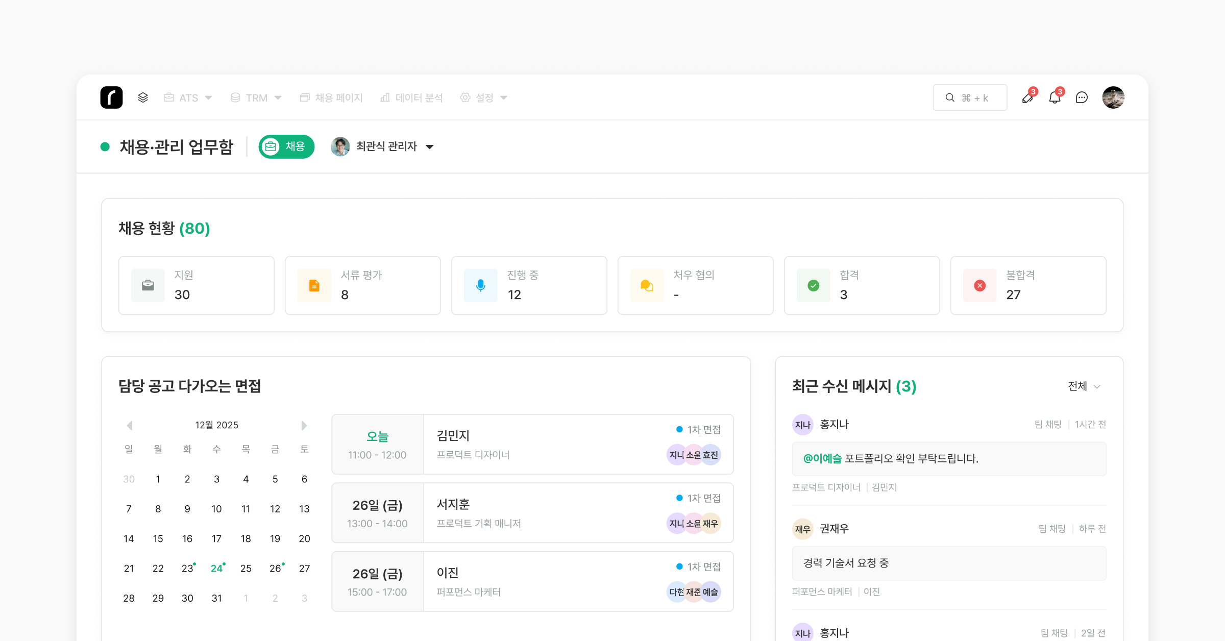 - 채용 현황, 가까운 면접 일정, 수신 메시지, 할 일, 평가 등 지금 해야 할 일 바로 확인