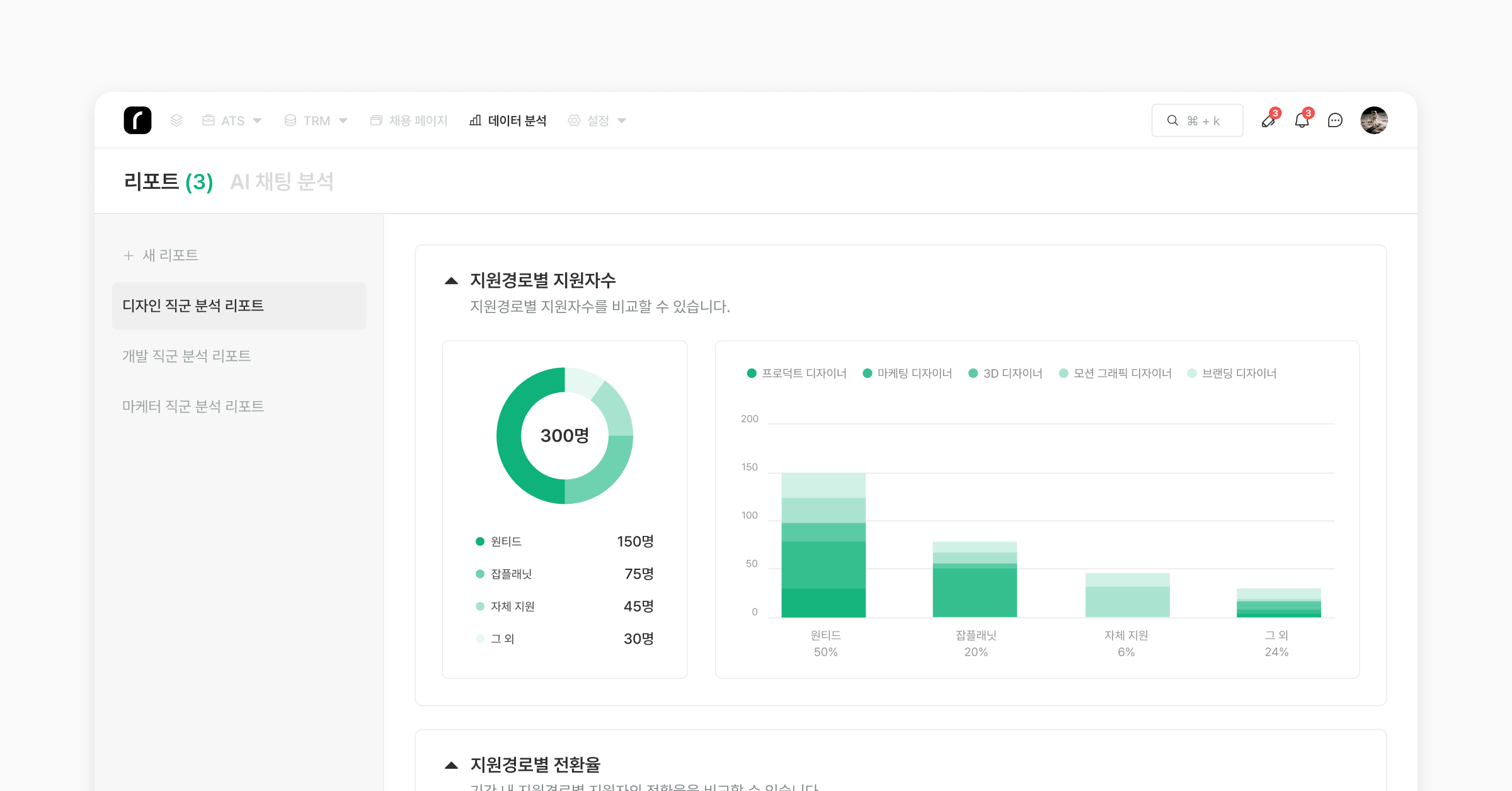 - 홈 상단 어드민바 메뉴 ‘데이터 분석’ > 완료된 채용에 대한 결과 리포트 열람 가능