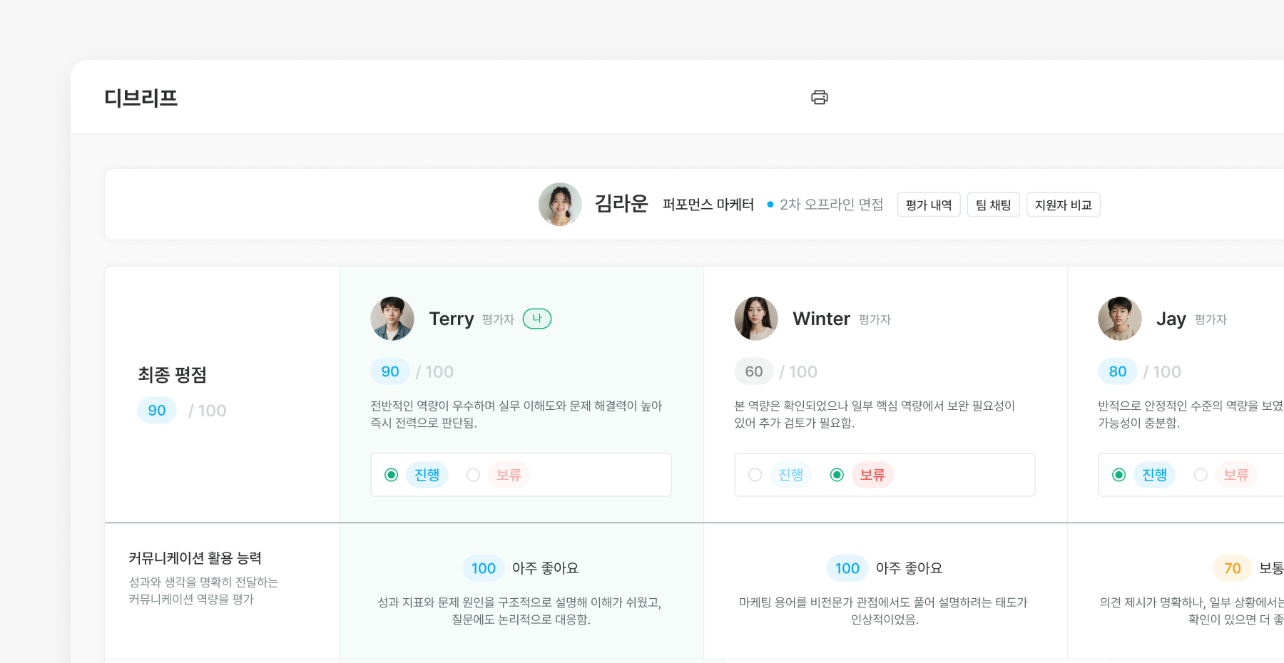디브리프 화면에서는 지원자에 대한 평가자들의 점수와 코멘트가 한눈에 정리돼 보입니다.
